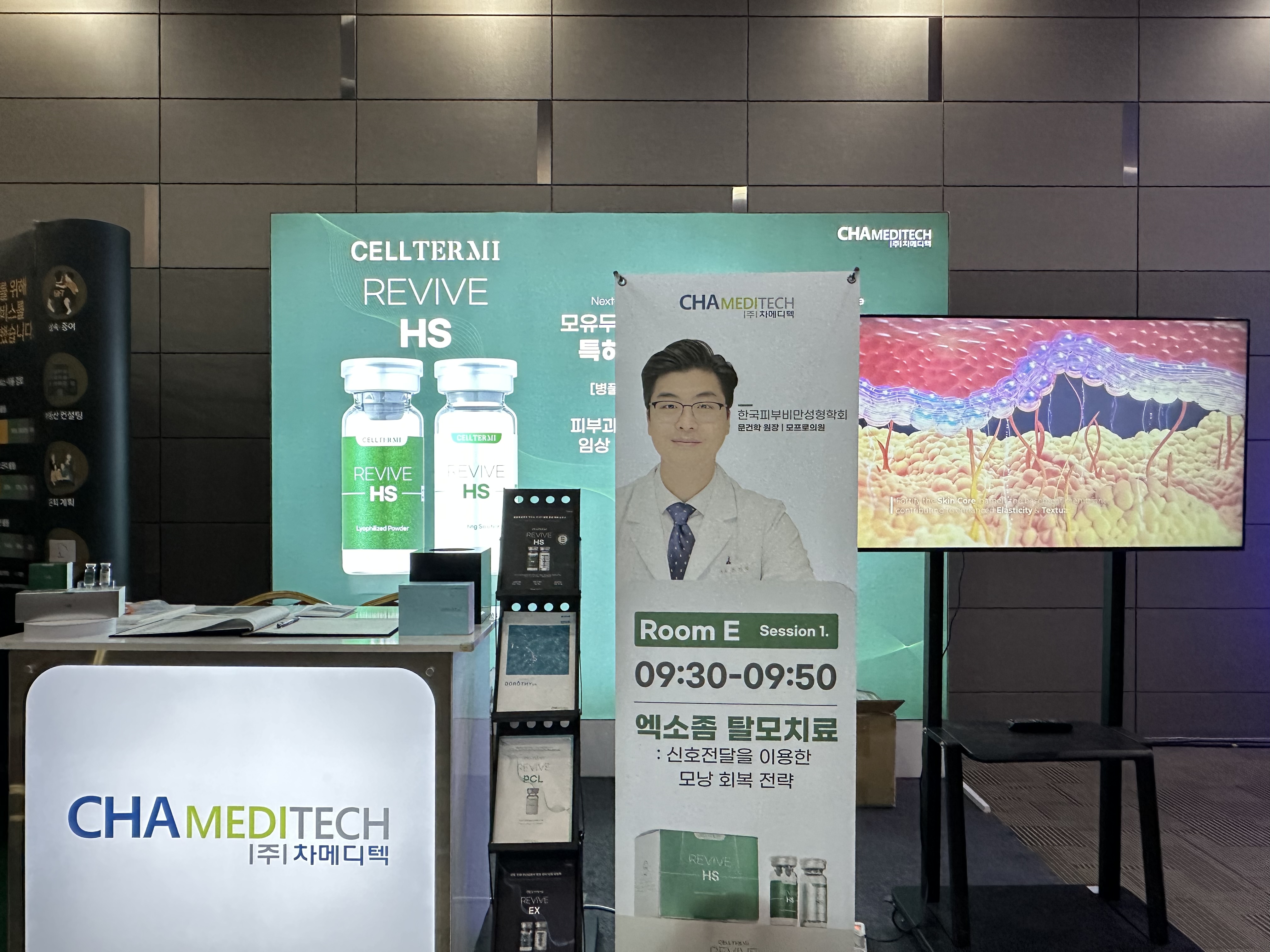 특히 이번 학회에서는 차메디텍에서 처음으로 신제품 셀터미 리바이브 HS 강연을 선보였다. 모프로의원 문건학 원장은 셀터미 리바이브 HS에 함유된 유산균 유래 EV의 신호 전달 기능을 이용한 탈모 치료 방안에 대해 모발 성장 주기부터 직접 진행하신 임상 결과까지 열의에 찬 강연을 진행하였다. (강의명: 엑소좀 탈모치료: 신호전달을 이용한 모낭 회복 전략)