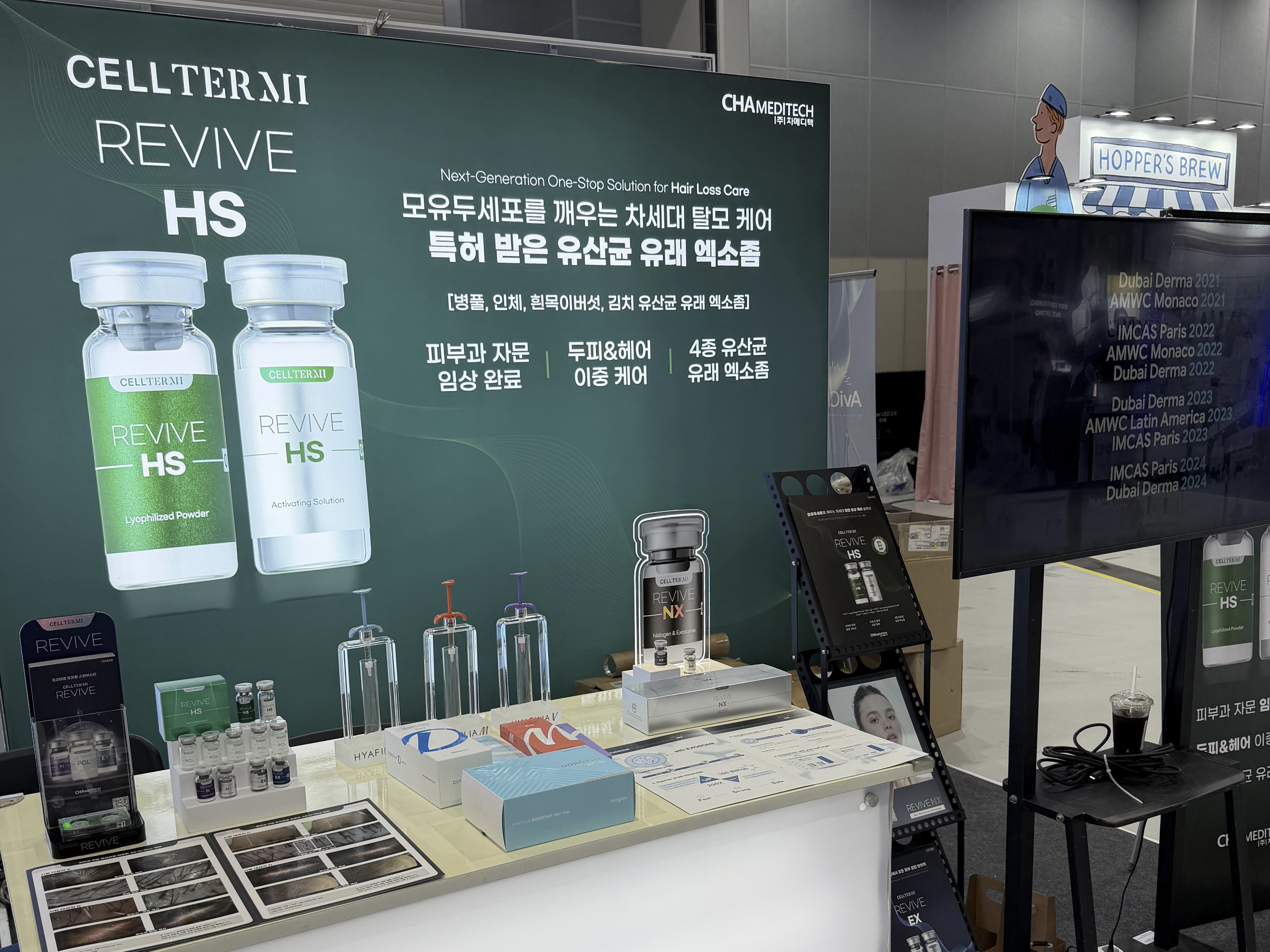 차메디텍 직원들은 1층 A63 부스에서 올인원 헤어부스터 셀터미 리바이브 HS(CELLTERMI REVIVE HS) 즉각적인 보습을 부여하는 도로시(DORTOHY) 국내 및 해외 수출용 스킨부스터 셀터미 리바이브 시리즈와 HA 필러 히아필리아(HYAFILIA) 시리즈를 선보였다. 전세계 다양한 국가에서 온 바이어들은 차메디텍이 자체개발한 유산균 유래 EV 원료들과 PCL 스킨부스터 등에 관심을 보였다는 후문입니다. 😊