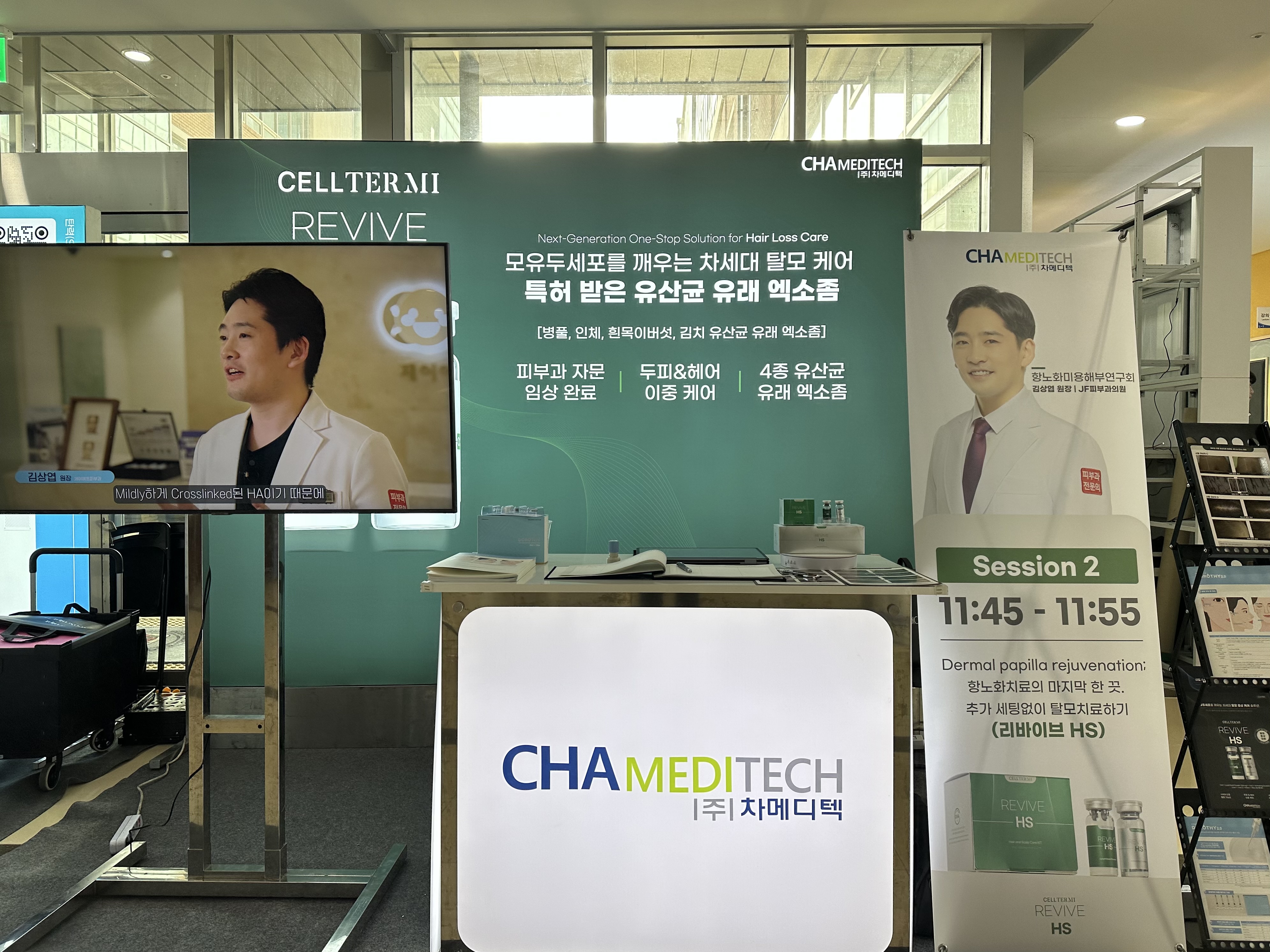 11월 30일 11시 45분부터 55분까지 약 10분 동안 JF피부과의원 김상엽 원장이 셀터리 리바이브 HS 제품을 강연하였다. 셀터미 리바이브 HS 개발 과정에서도 진심어린 조언을 많이 제공한 만큼, 김 원장의 강연에는 여러 유익한 내용이 녹아 있었다. 김 원장은 셀터미 리바이브 HS에 함유된 유산균 유래 4종 EV와 피부 기저막을 튼튼하게 잡아주는 CHA-Nidogen-1 성분에 대해 설명하였고, 헤어라인과 정수리에 넉넉하게 사용할 수 있는 7ml의 용량이 큰 장점이 될 수 있음을 강조하였다.(강연명: Dermal papilla rejuvenation; 항노화치료의 마지막 한 끗. 추가 세팅없이 탈모치료하기(리바이브HS))