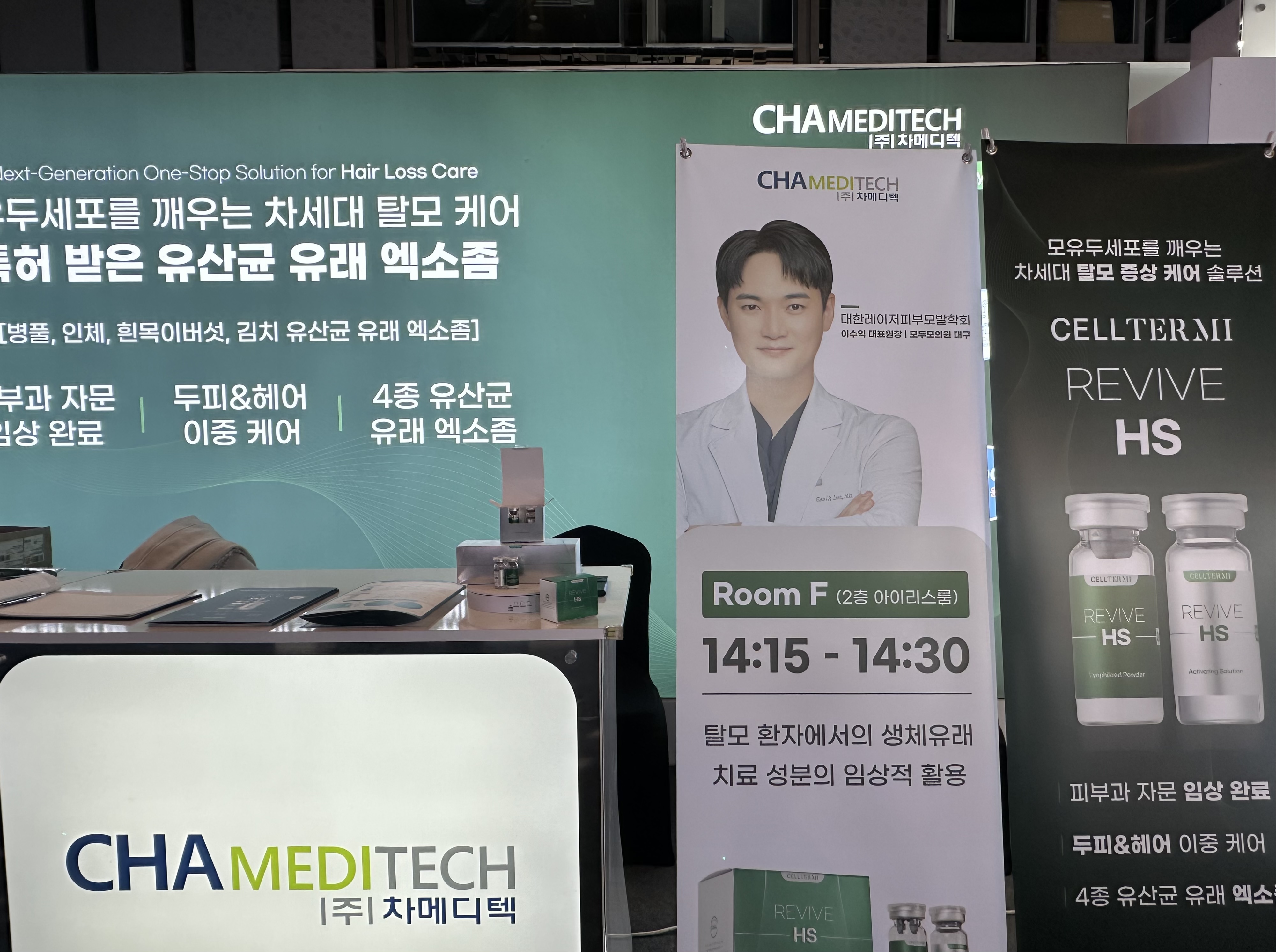5층 그랜드볼룸 B57, B58에 마련된 차메디텍 부스에서는 두피와 모근을 같이 케어하는 올인원 헤어부스터 셀터미 리바이브 HS와 스킨부스터 도로시를 선보였다. 헤어&두피 강의룸인 F룸(아이리스룸)에서는 14시 15분부터 30분까지 셀터미 리바이브 HS를 주제로 모두모의원 이수익 대표원장님의 강의가 있었다.